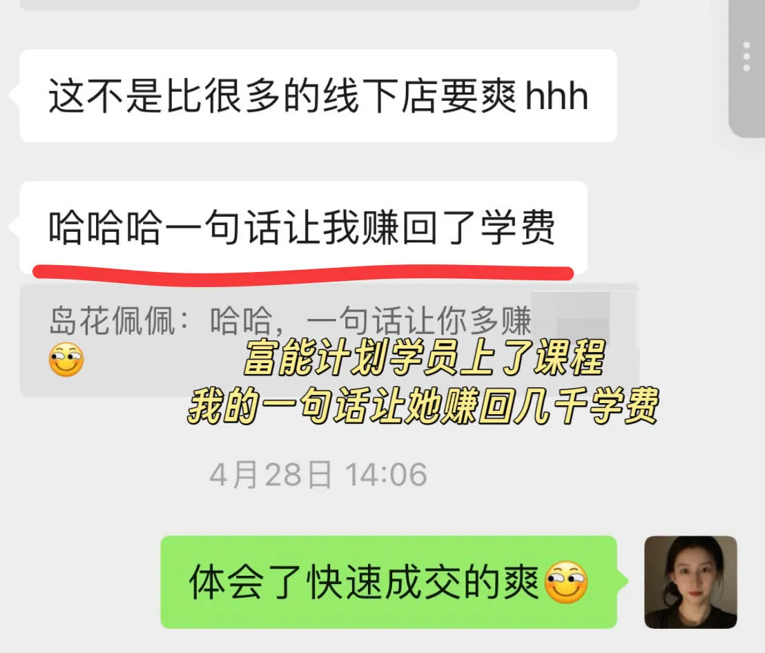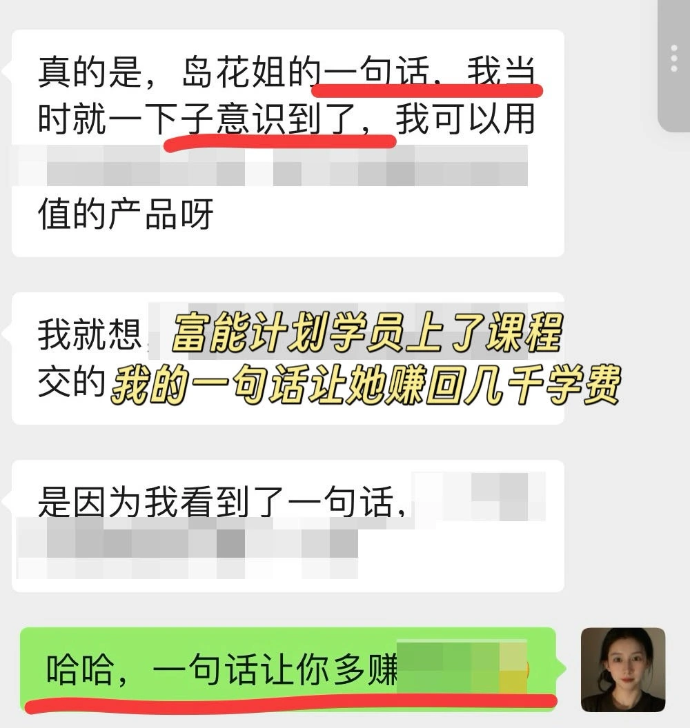 哪怕不聊天,看岛花的朋友圈也能学到超多价值,毕竟岛花这些年所有项目的变现,都是靠朋友圈自动成交的。