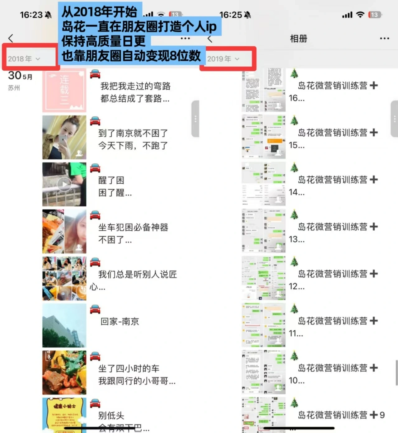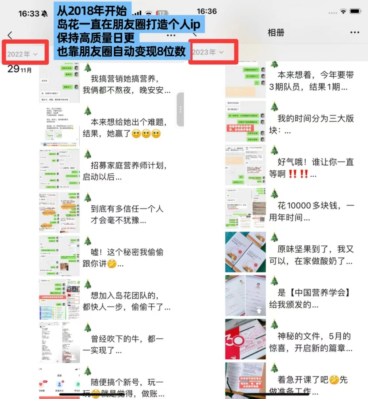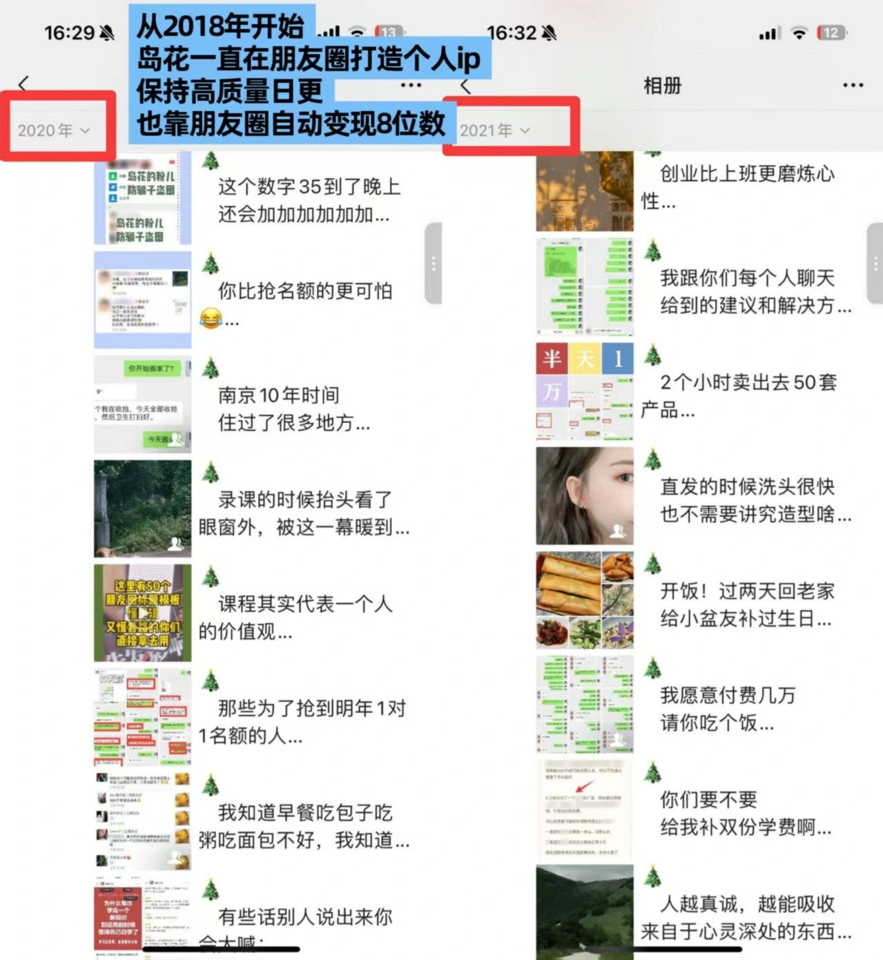 可查看岛花近10年来是如何结合朋友圈营销,ip打造,实现自动收钱的(从2018年到2025,岛花的朋友圈一直保持高质量日更)。