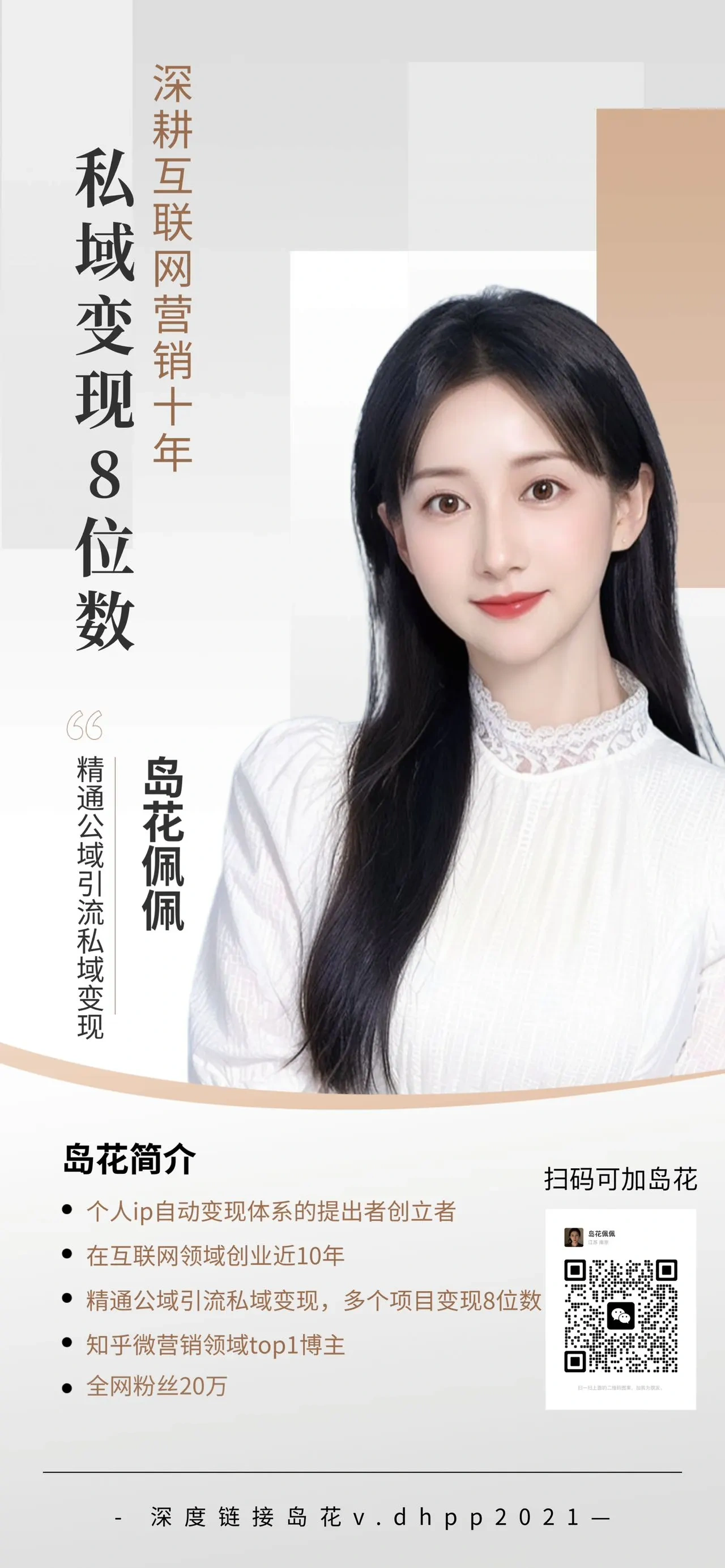 岛花在互联网营销领域实战了10年,创立出个人ip自动变现的全套逻辑和体系,掌握以后,各行各业都可以结合自媒体和朋友圈实现自动收钱(站着赚钱)。