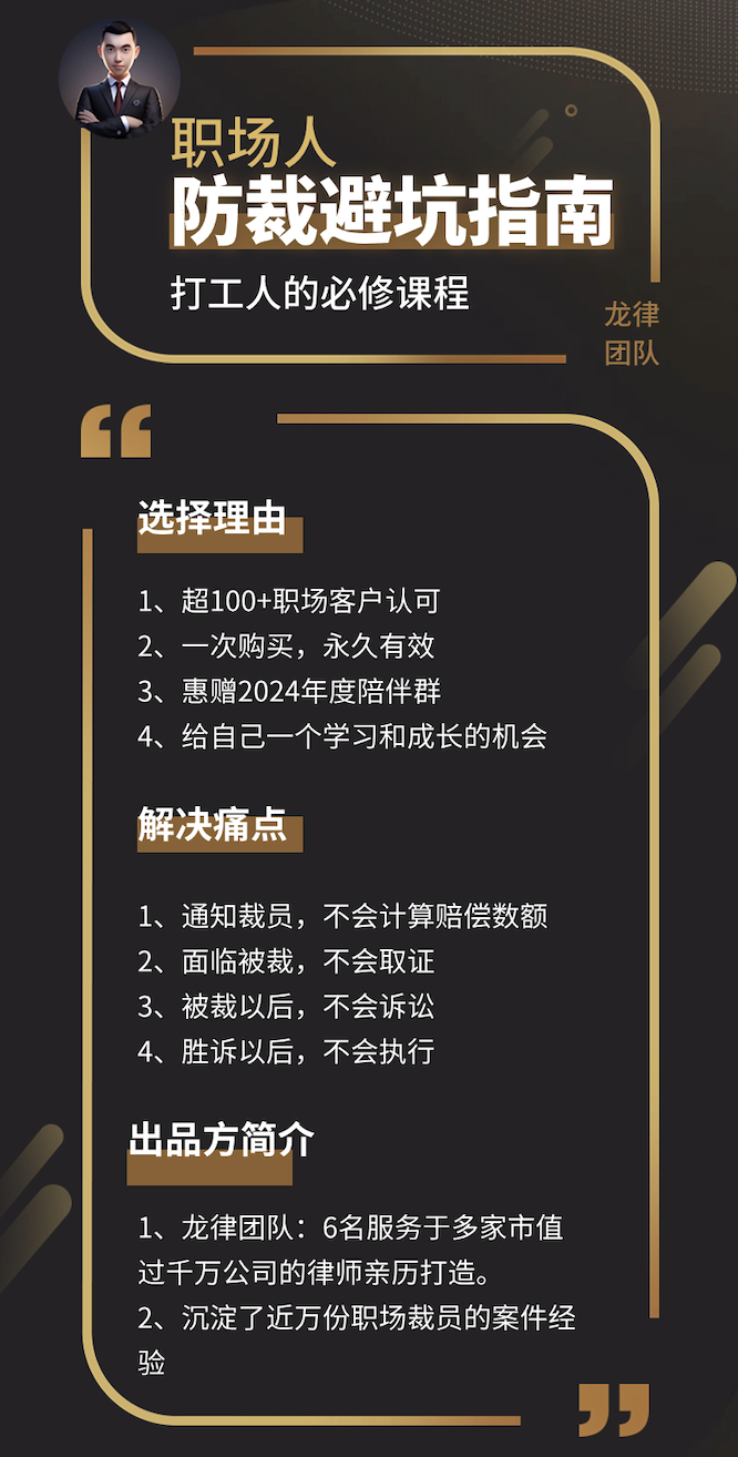 兴龙律师团队,团队拥有6名以上的专业律师,团队是多家商业公司的法律顾问。 本手册整合了100个职场CPU样本,可读性强、简短、干脆、不啰嗦。 原价399,首发限时10元永久买断,每满50人涨价一次。 购买后加微信dj51818 ,发支付截图,拉你进陪伴群。再送一份职场CPU话术反击指南, 从此轻松应对职场各种坑。