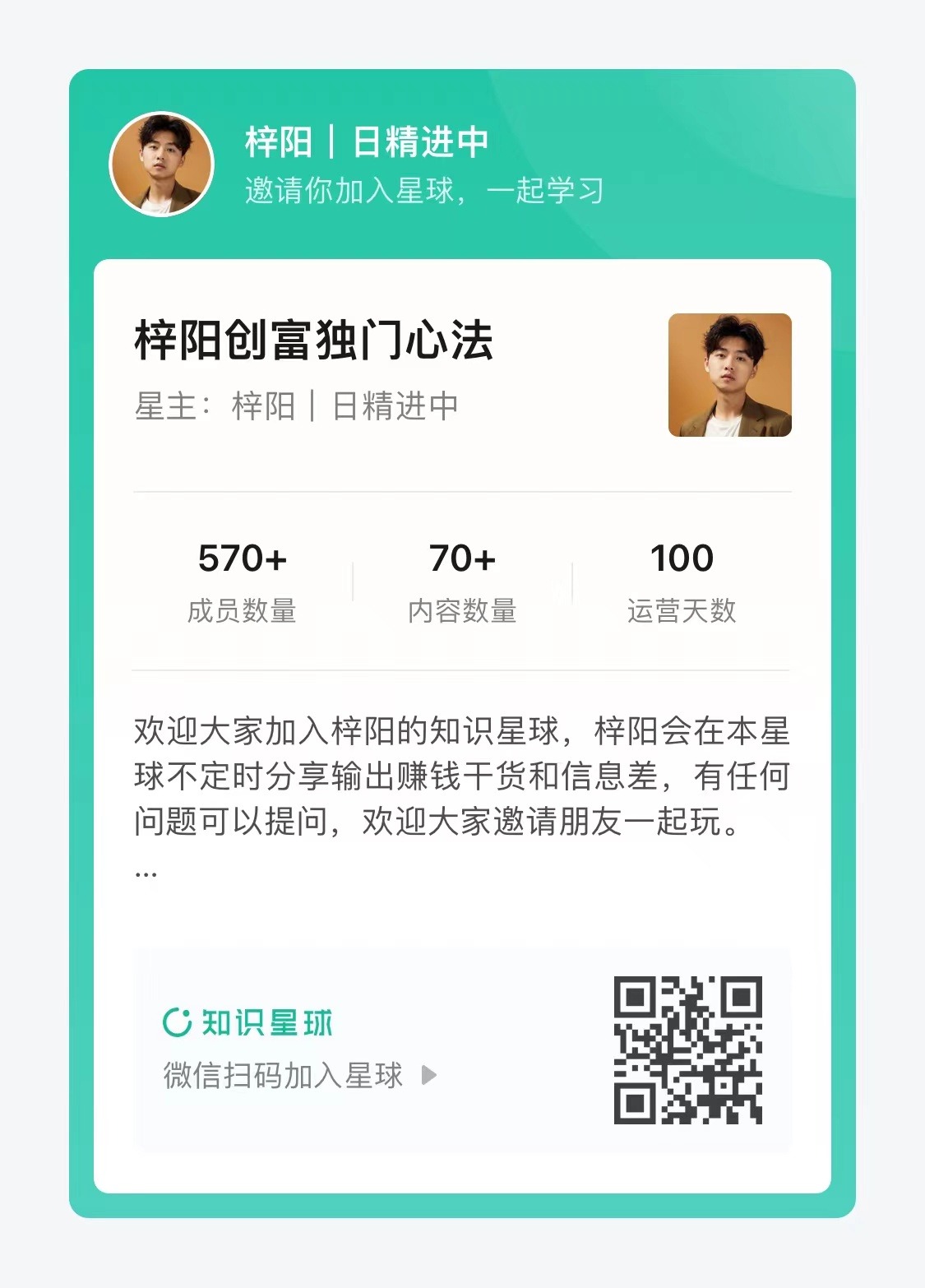 下面是梓阳的免费知识星球,平时会输出一些梓阳自己的认知思考,所想所得等,点击或扫码限时免费加入!